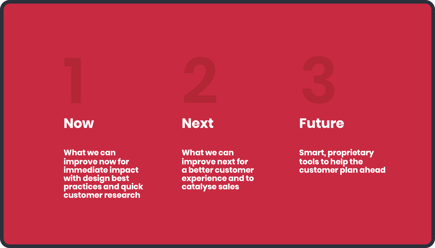 We designed the project in three phases: Now focused on simplifying navigation and booking for quick wins, Next introduced personalisation with dynamic listings and conversational search, and Future envisioned AI tools like the Future Price Predictor and Customer Genomes. Research across buyers, sellers, tenants, and agents revealed pain points, while audits of content and data exposed opportunities to streamline flows and prioritise key information.
