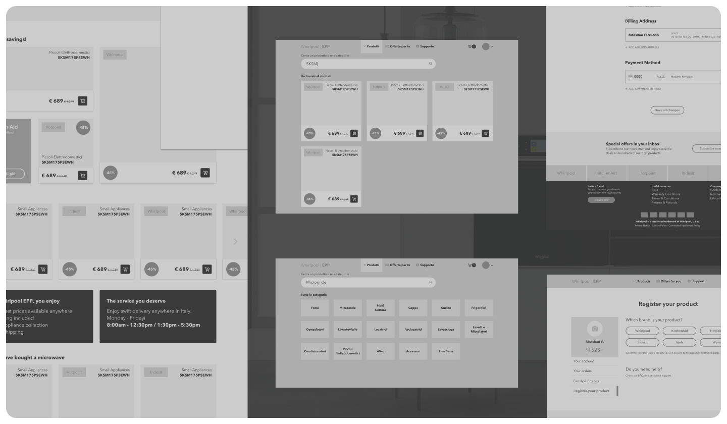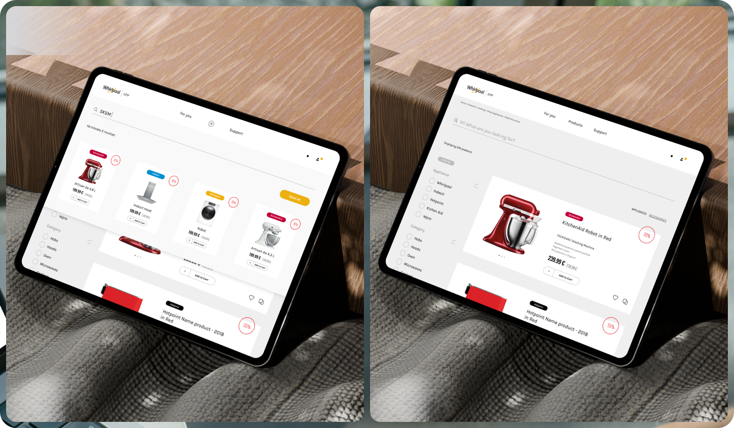 Designing the platform visually was complex because five brands needed to coexist. We created a minimal and clean visual language that allowed each brand to express itself without clashing. A subtle touch of yellow referenced Whirlpool, the parent brand, while brand and product pages were free to communicate in their own tone.